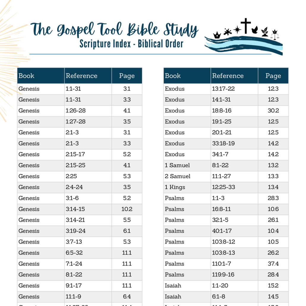 The Gospel Tool is deeply rooted in Scripture; each lesson refers to multiple passages. It may be helpful for you to have an overview of all of the passages that are directly studied throughout the Gospel Tool journey.